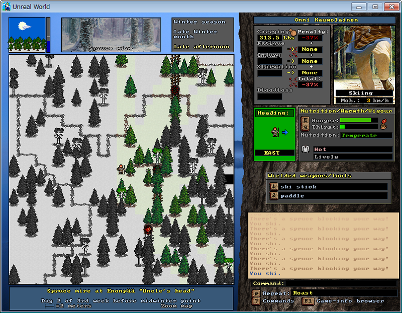「Beginning of Winter month」とあるので12月の初めくらい? いつの間にか地形が雪になってたのでスキー板とストックの材料集めに奔走。furやleatherの服を買い集めてなんとか製作完了。スキーなしで雪の上を移動するとfatigueがどんどん溜まるので狩りどころか普通の生活でも困るようになる。スキー板、ストック両方装備でfatigue上昇はなくなるけどrunningやclimbingができなくなるのでそれはそれで面倒。